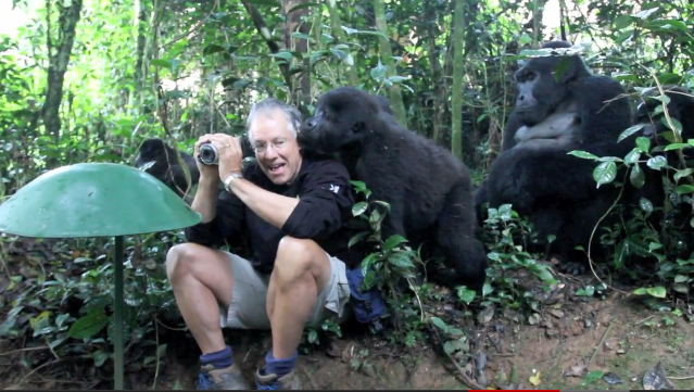 Ob koncu nekajdnevnega izleta v ugandskem nacionalnem parku Bwindi sta se prijatelja srečala s skupino divjih goril, ki je obiskala turistično naselje v parku.
