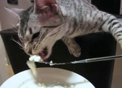 Mačke so mojstrice olike – ne le, da vedo, da med jedjo komolci ne sodijo na mizo, celo vilice znajo vihteti kot prave dame in gospodje!