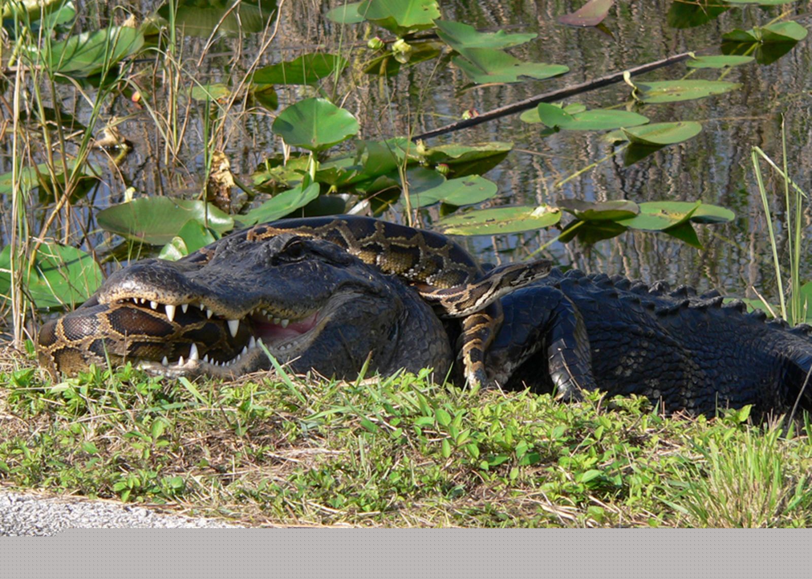 Živali na floridskem močvirju Everglades vse bolj ogrožajo indijski pitoni, ki jih v naravo spuščajo njihovi lastniki po tem, ko se jih naveličajo kot eksotičnih ljubljenčkov. Število sesalcev zato na tem območju drastično upada.