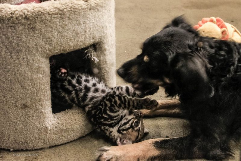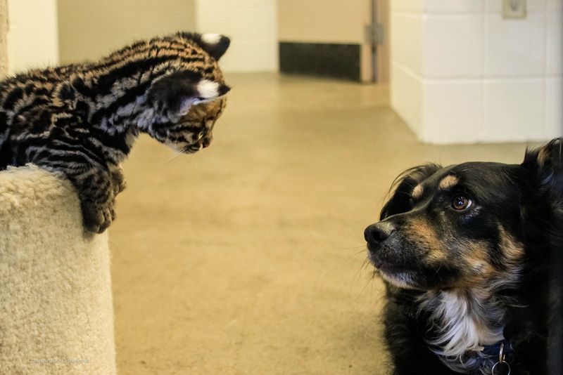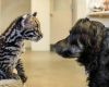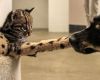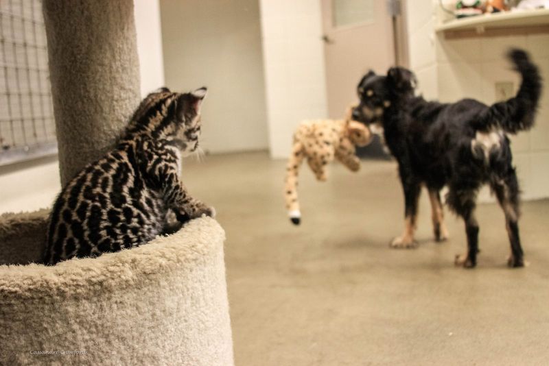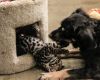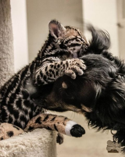 Devet tednov star ocelot Santos se po vedenju prav nič ne razlikuje od svojih udomačenih sorodnikov – radovedno raziskuje svojo okolico in uživa v igri s svojim novim pasjim prijateljem.