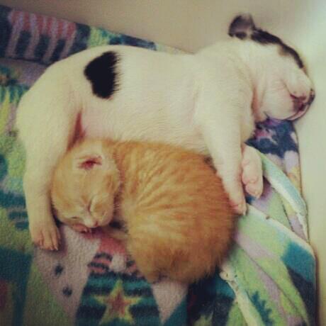Mucek tako odrašča s pasjima bratcema. Skupaj jejo, se igrajo in spijo, pri tem pa poskrbijo za obilico srčkanih trenutkov.