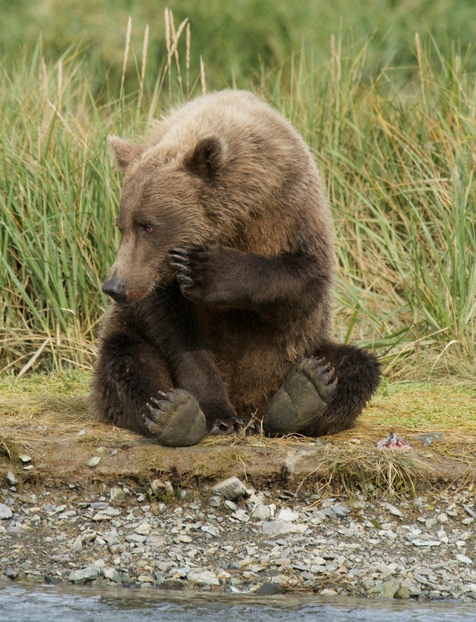 Nekaj trenutkov kasneje je medved stegnil taco in pograbil kamen, ki je bil pokrit z raki vitičnjaki – ti svoje telo, obdano z apnenčastimi ploščicami trdno pritrdijo na podlago, takšna groba površina pa je bila očitno ravno to, kar je medved potreboval, saj si je pričel s kamnom drgniti obraz in vrat.