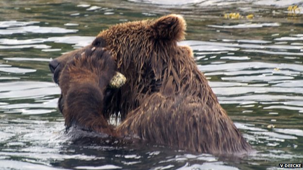 Dr. Deecke sicer preučuje kite, takrat pa je na obali nacionalnega parka Glacier Bay na Aljaski opazoval dva rjava medveda, ki sta se prehranjevala s truplom poginulega kita. Naenkrat je se je eden od medvedov potopil v vodo in na morskem dnu nekaj iskal.