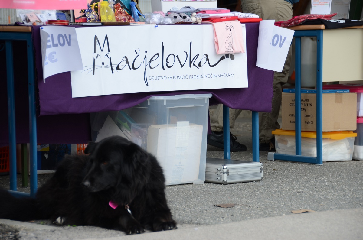 Čara, ki je danes varovala stojnice društev Mačjelovka, Kosovir in Društva za zaščito živali Ljubljana, je v Zavetišču Ljubljana bivala kot mladiček, v nov dom je odšla marca 2003.