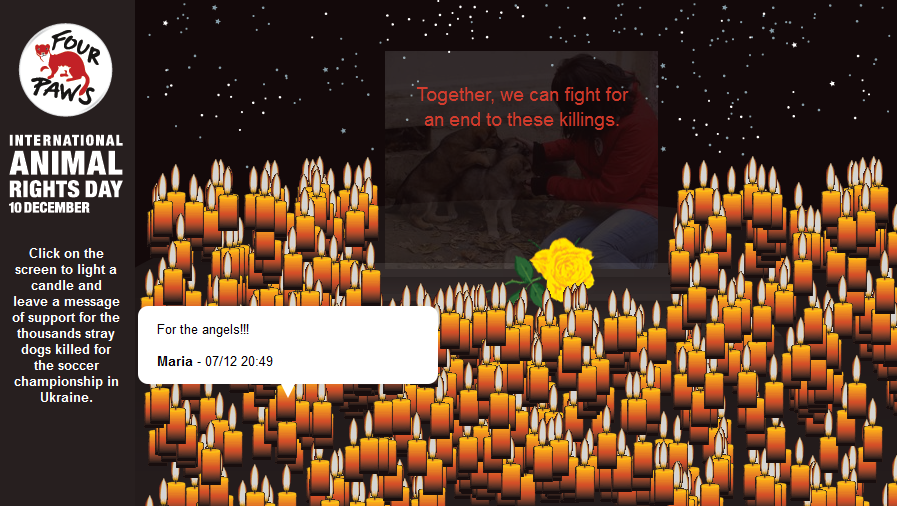 Mednarodna organizacija za zaščito živali Vier Pfoten tako danes ljubitelje živali poziva, naj prižgejo virtualno svečko v spomin na tisoče brezdomnih psov, ki so jih letos v Ukrajini pobili, da bi počistili svoje ulice pred pričetkom evropskega prvenstva v nogometu junija prihodnje leto.