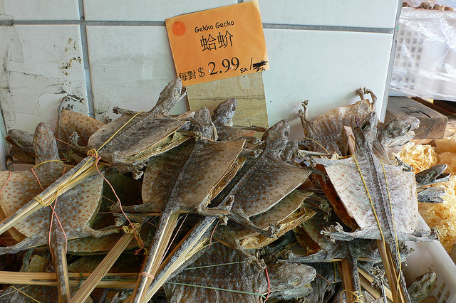 Posušene gekone lahko kupci najdejo tudi v Kanadi - fotografija je nastala pred vancouversko trgovino s tradicionalno medicino. Foto: donkeycart, Flickr CC