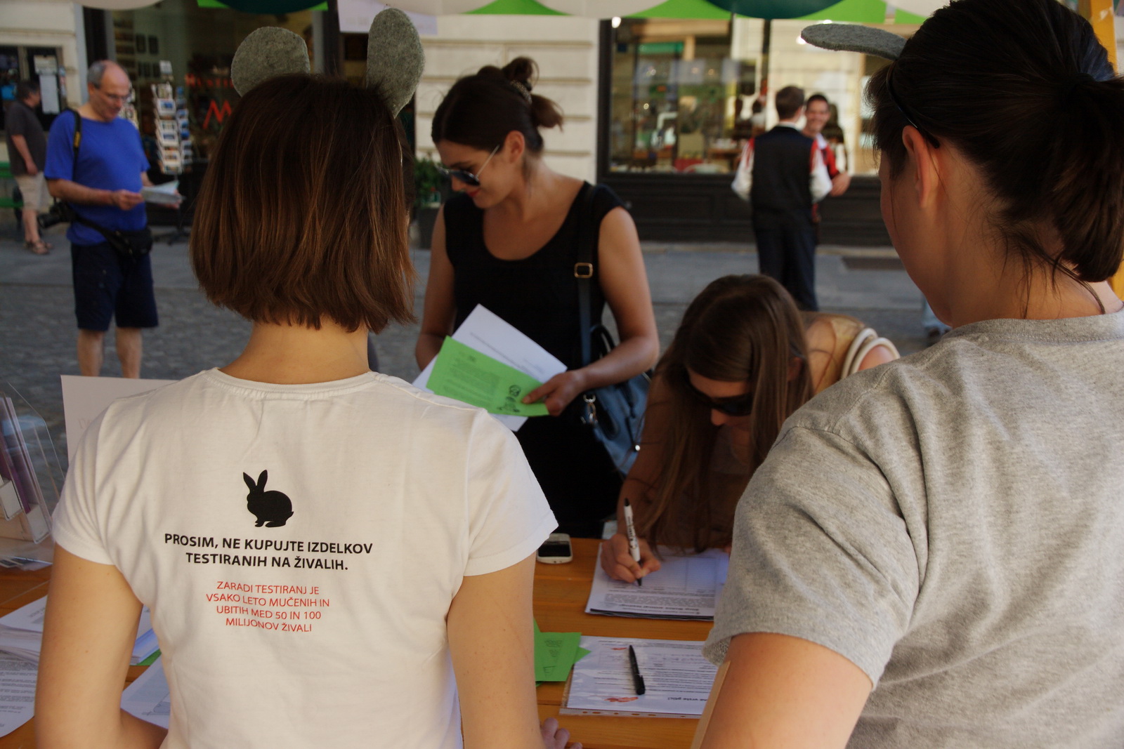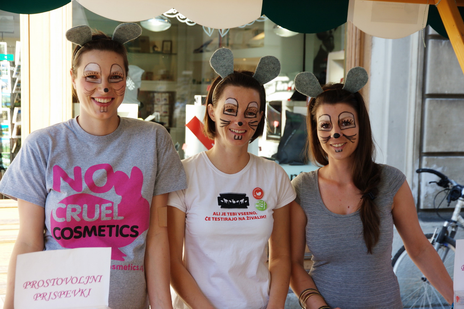 DZZŽ Ljubljana je v torek v okviru mednarodne kampanje Ustavimo testiranje botoksa na živalih na ljubljanskih ulicah osveščalo mimoidoče o poskusih na živalih, ki trpijo v imenu človeške nečimrnosti.