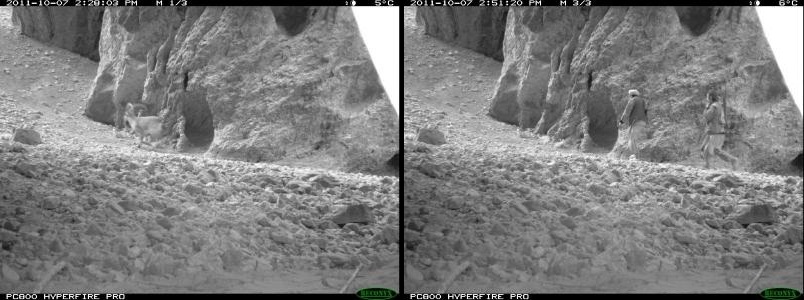 Le nekaj minut za tem, ko je kamero sprožil kozorog, sta mu po isti poti sledila oborožena krivolovca. Foto: WCS Afghanistan Program