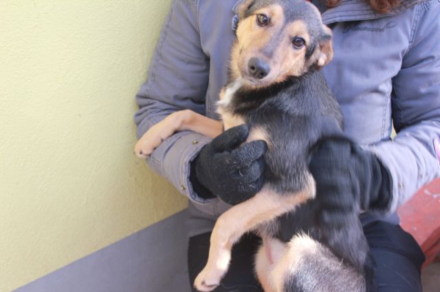 Pet mesecev stara Goya do tujcev sicer pristopa še nekoliko previdno, vendar se hitro sprosti in pomaha z repkom.