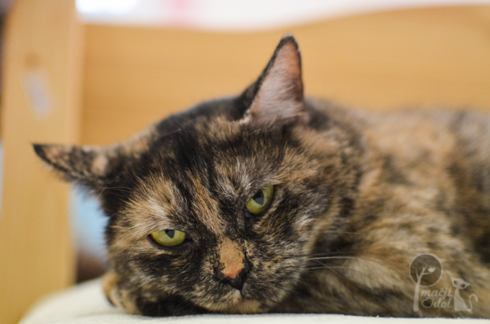 V zavetišče Mačji dol so jo sprejeli skupaj s tremi mladiči, za katere je vzorno skrbela. „Vedno so rinili za njo, tako da revica ni imela časa niti pojesti brez treh okroglih buč ob sebi. Potem smo jo prestavili k velikim mačkonom in sedaj je kar malo bolj srečna,“ nam je zaupala njena oskrbnica Monika.